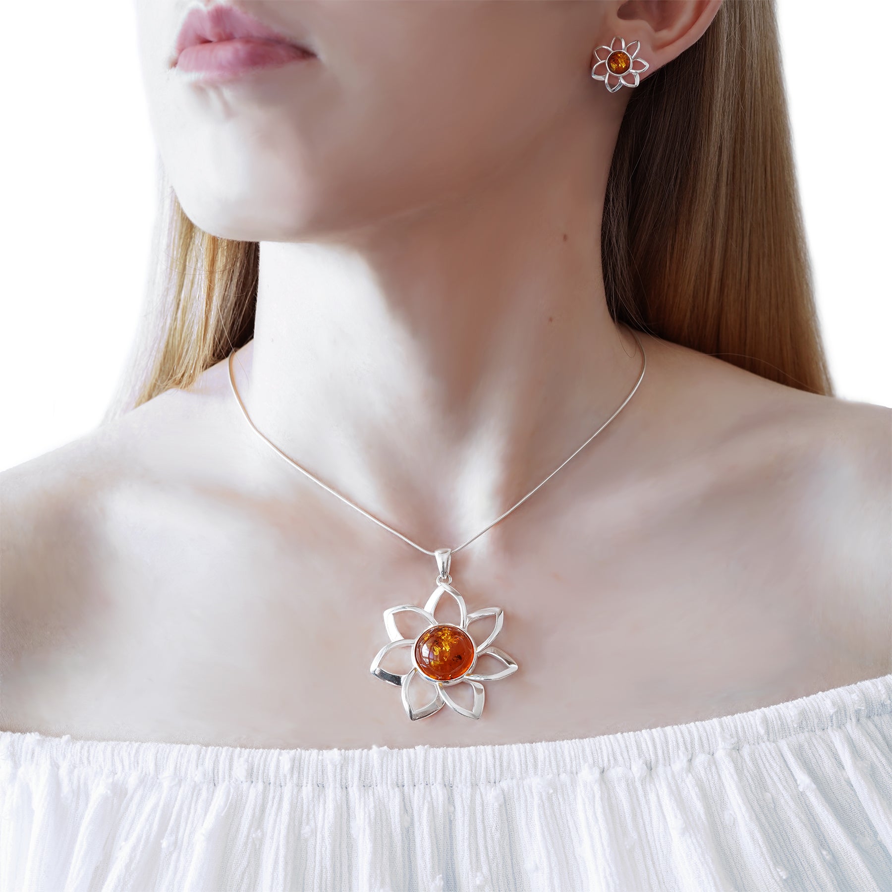 Amber Flower Studs in Sterling Silver
