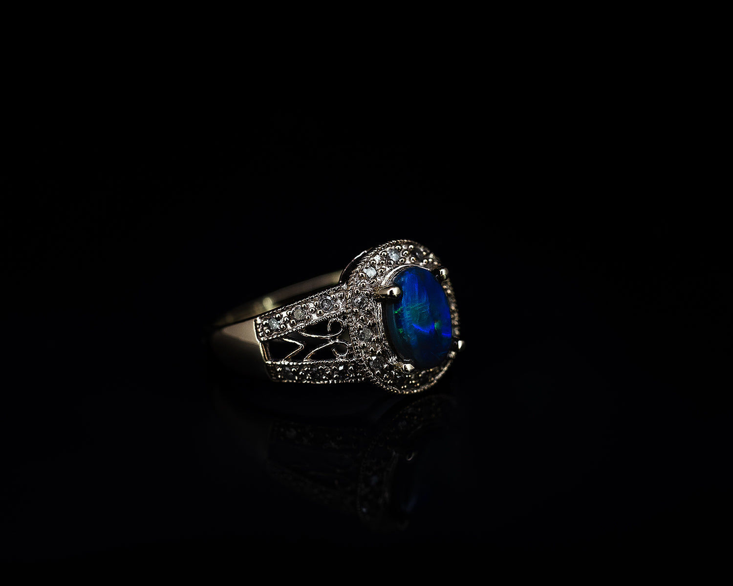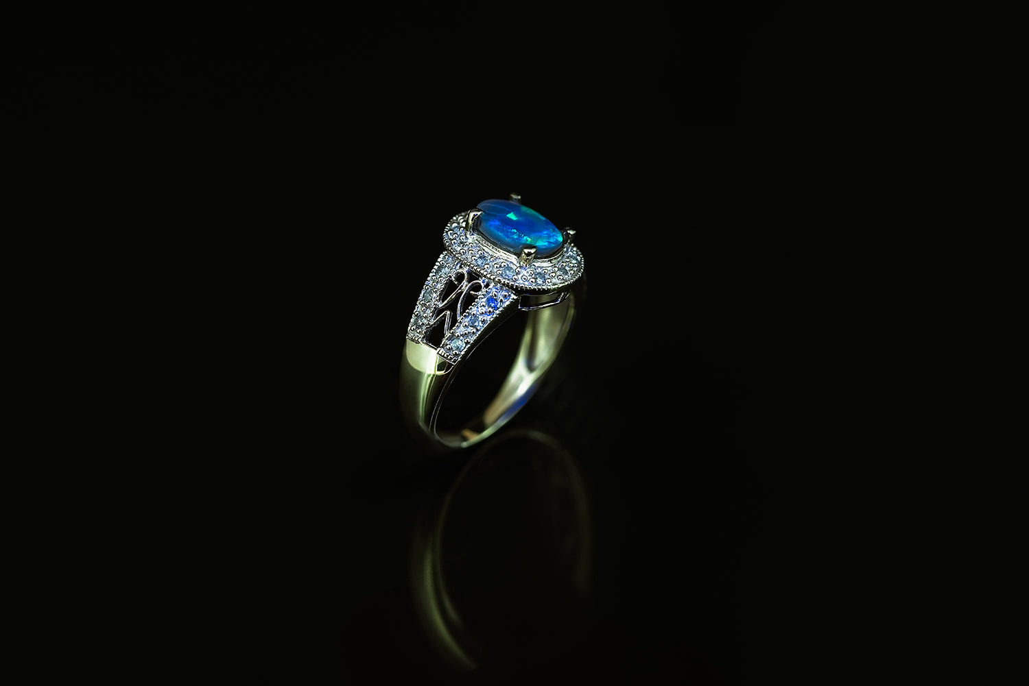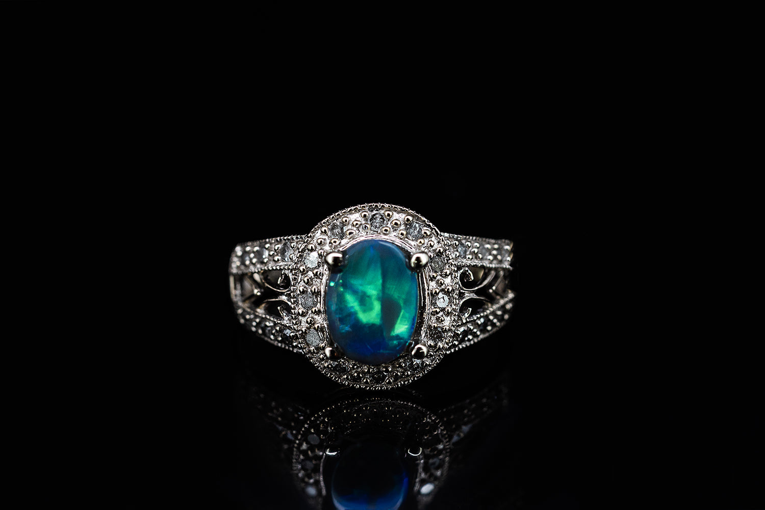 Black Opal Ring with diamonds set in 10ct White Gold