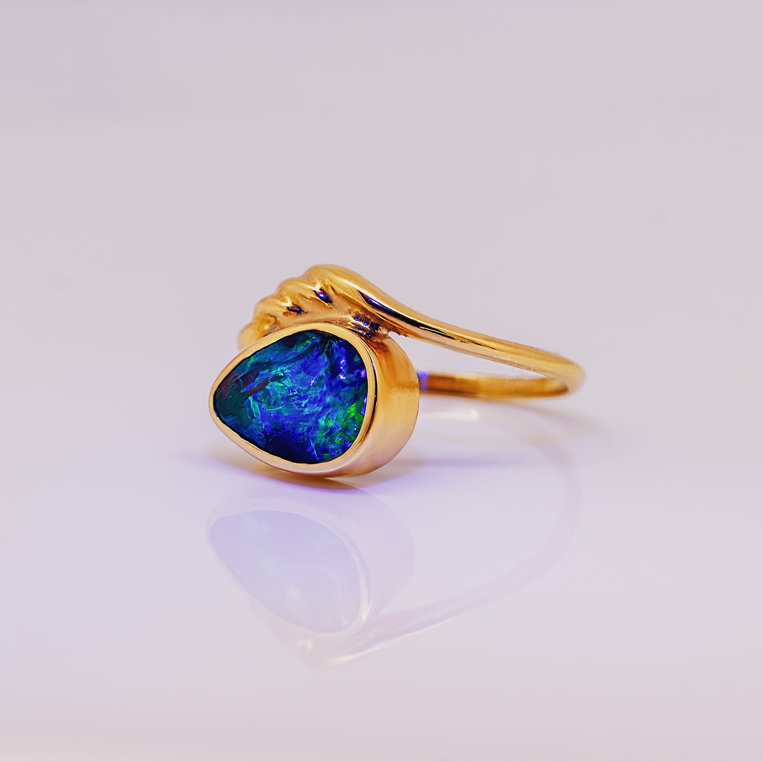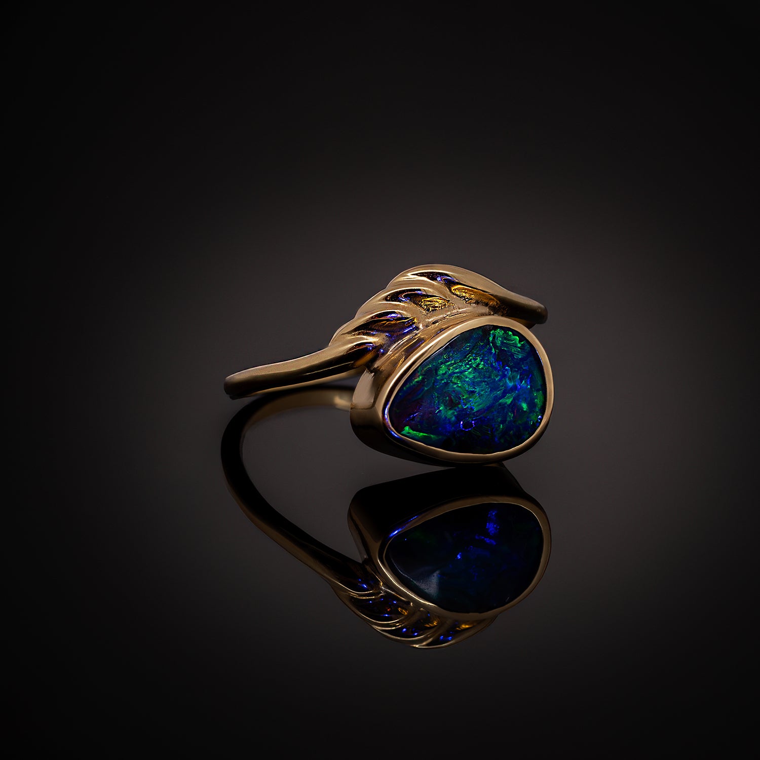 Shiny Blue and Green Boulder Opal Ring set in 18ct Gold