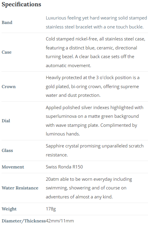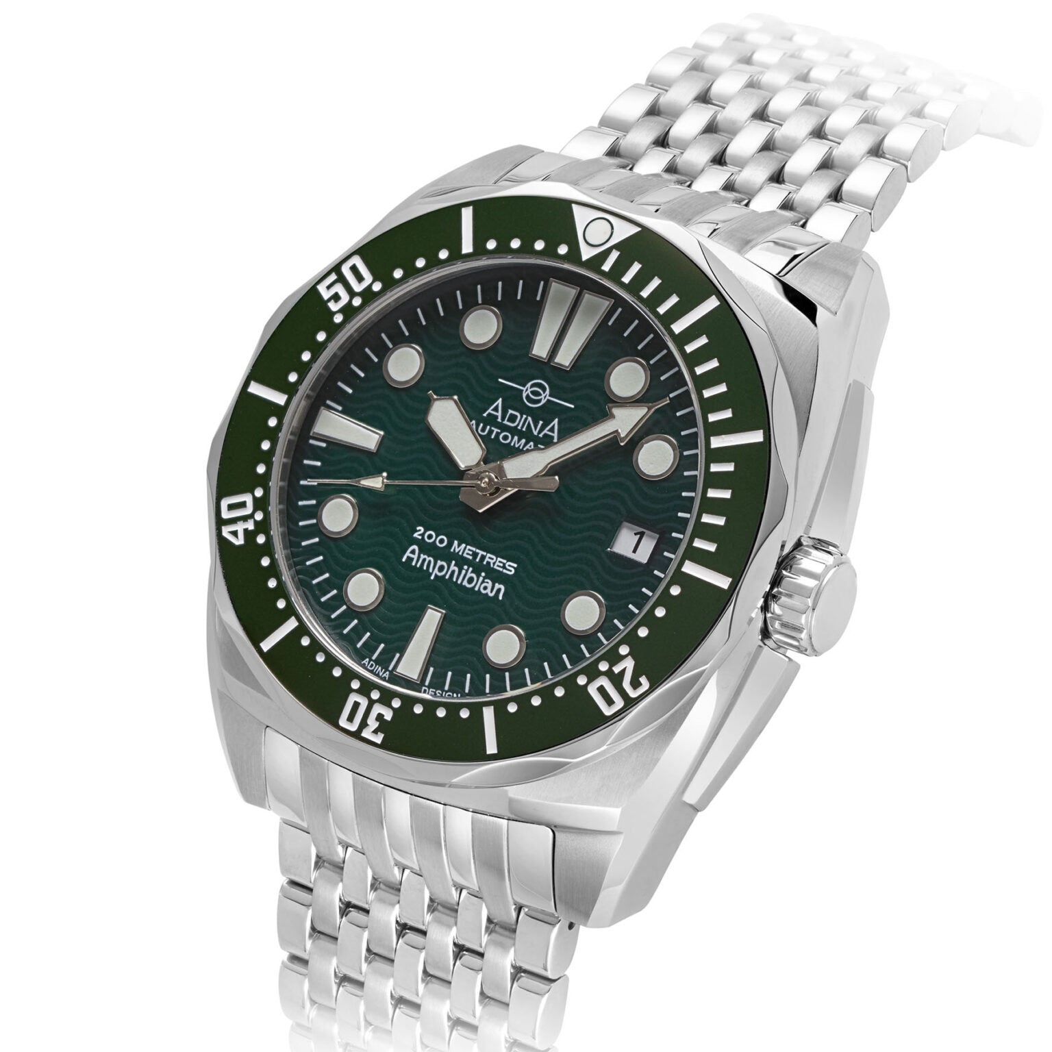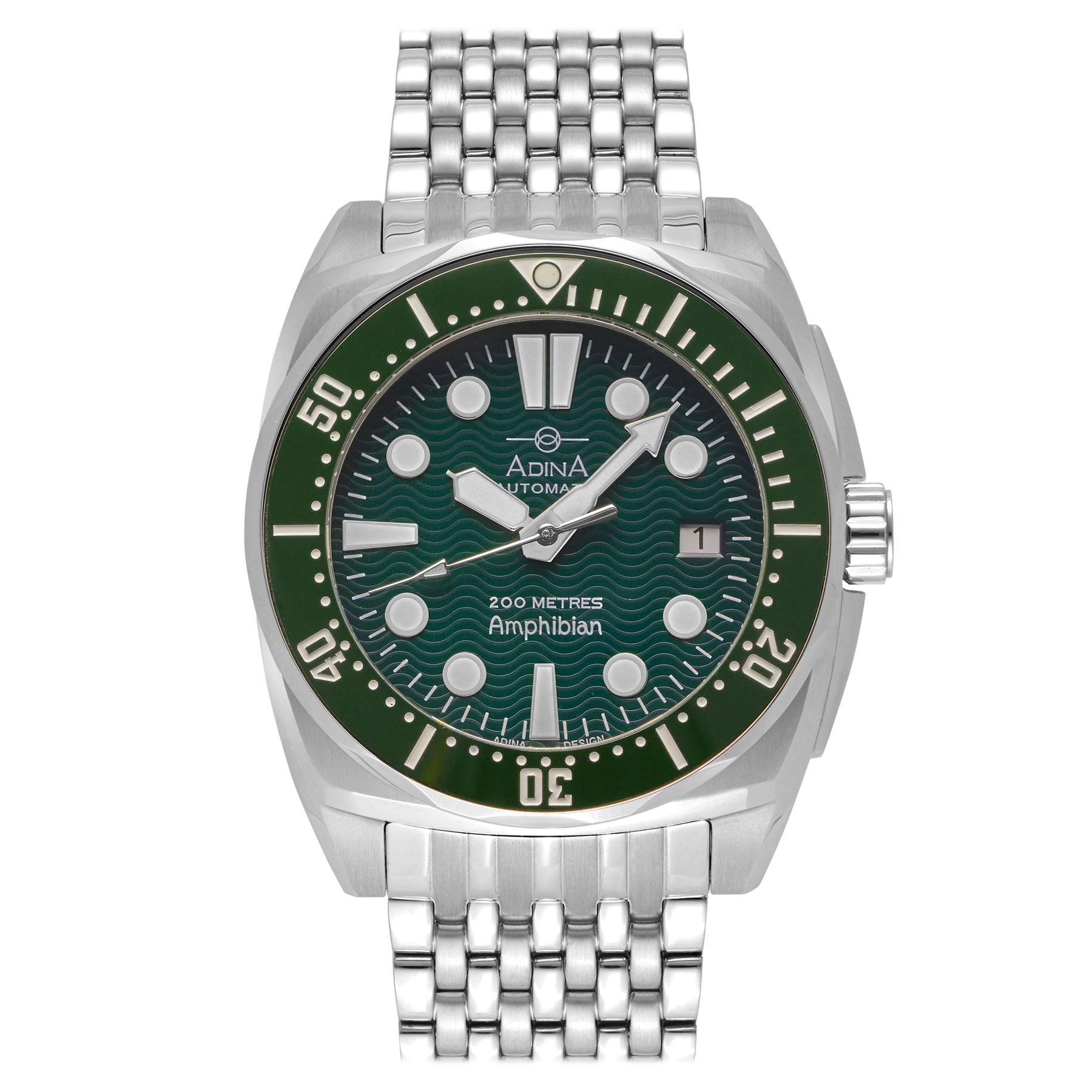 With a water resistance rating of 200m, the Adina Amphibian is perfect for divers and water sports enthusiasts. The watch features a scratch resistant green ceramic rotating bezel. This allows for precise time tracking during dives. The luminous indexes on the green dial make it easy to read in low light conditions. The steel case and bracelet adds to the durability of the watch, making it resistant to scratches, shocks, and other damage.