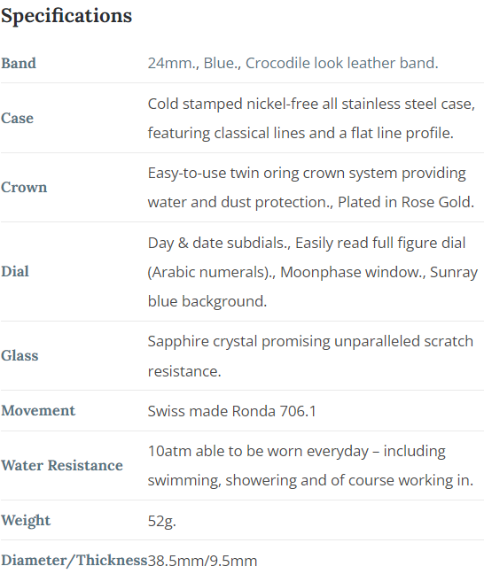 Day & date subdials., Easily read full figure dial (Arabic numerals)., Moonphase window., Sunray blue background. |